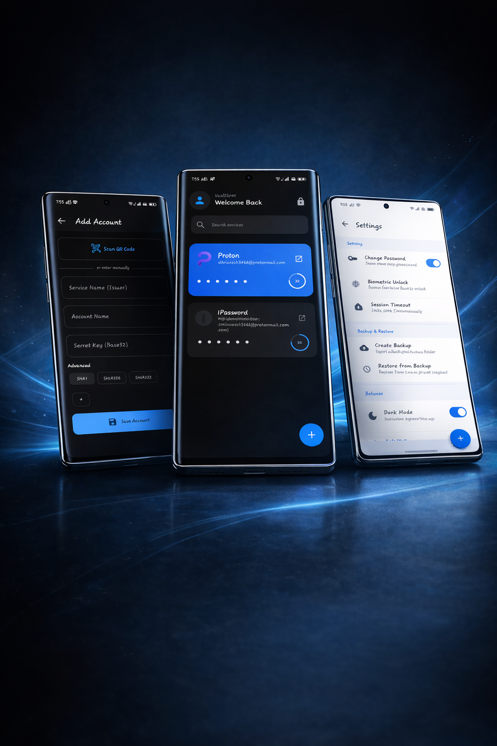 One-tap backup to any folder. AES-256-GCM encrypted with a separate password. Auto-backup on every change.